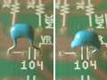 小さい「つぶ状」のほうには極性はありません。ここで使用するのは「セラミック・コンデンサ」と呼ばれるものです。容量は全て 0.1μF で,“104”と書かれています。これは,10×104=100000pF(ピコ・ファラッド)という意味です。