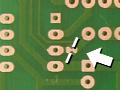 なお,このコンデンサ設置用には穴が3つあり,そのうち2つを使用します。これは,部品のリード線の幅が2種類(5.08mm,2.54mm)あり,そのどちらでも使えるようにするためです。3つのうち,線でつながっている2ヶ所は導通しているので,そのうちの片側と,残りの1ヶ所を使い,必ず描かれた「2本線」をまたぐように設置します。右の写真のどちらかのように設置することになります。