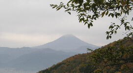 紅葉の彼方に富士山。視界の全てを見せられないのが残念です。 |