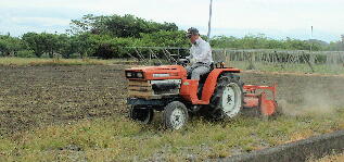 埃を立てて田の耕運