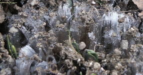 霜柱が立っている中から水仙の芽が出てきました。
