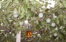 カメムシは、木酢液のにおいが嫌いで寄ってこないという記事を見たので、早速ペットボトルに穴を開けスモモの木の下につるしました。