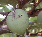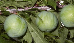 我が家のアーリーソルダムもこんなに大きくなりました。核割れの(種が割れているため不整形)中には色づき始めたものもあります。たぶん今月の下旬には出荷できると思います。 |