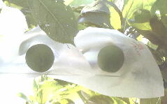 貴陽は、熟すとき枝に付いているところが雨にかかると割れやすいので、雨除けの傘をかけます。