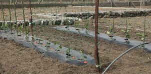 マルチに植え穴を開け支柱を立てて、キュウリだけはネットをしました。
