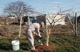 この頃雨が降らず乾燥しているので、朝一番、剪定の前に昨年末新植した苗に水をやりました。
