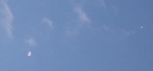 剪定をしていた午後4時過ぎ頃、飛行機雲を引きながら月の隣を通り過ぎていきました。小さくてわかるかな?