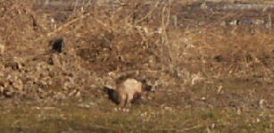 草が生い茂っている隣の畑に狸と思われる動物がいます。