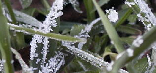 畑は一面に霜が降り、麦の緑とコントラストをなしています。 |