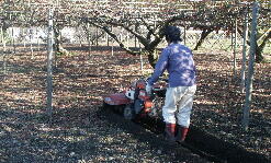 散布後に土と攪拌します。これが終わると堀割(溝掘り)をし稲藁や落ち葉を入れます。