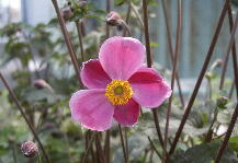 秋姫を育成している畑の隅で、ヘチマの葉を日除けとしている秋明菊が可憐な花を咲かせ始めました。