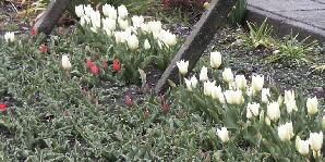 この暖かさにチューリップが一斉に開き、道行く人の目を楽しませています。