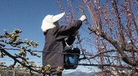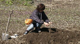 子供クラブの歓送迎会に出席した後、スモモの仲間ヨーロッパスモモ「プルーン」の苗を植えました。