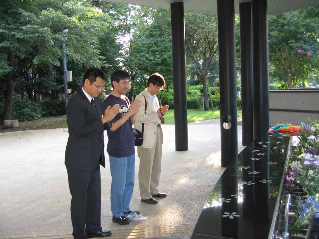 2006年9月2日16時30分、多磨霊園の合葬埋蔵施設に眠る故・折笠令吉先生の墓前に、有志4名が3年C組を代表するかたちで御花を捧げさせていただきました。当日は直前まで天候不良が予想されていましたが、現地に到着してみると快晴となり、残暑もさほど厳しくなく御蔭さまで滞りなく墓参をさせていただきました。![]() その後、19時より新宿にて「偲び呑む会」を催させていただき、1次会2次会で延べ9名の方々にご出席をいただきました。 ![]() 中には30年振りの再会となった方もおり、恩師を偲びつつゆっくりと話をさせていただくことができました。 ![]() ご出席いただけなかった方々からも丁寧なご挨拶を多数いただきました。謹んで御礼申し上げます。 ![]() |