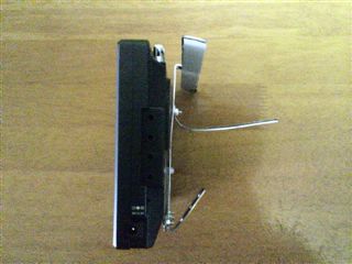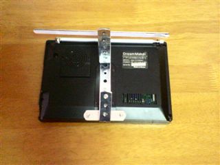 ホームセンターで金属ステーを買ってきて、ネジ止めしただけ。見難いですが、T型にしたステーに山型のステーを付けて、山型のそれをモニタ裏の溝に差し込んでます。 |
