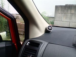 ブースタ部をAピラーの中に収納。ついでにケーブルはピラーを這わせて天井裏から配線。これですっきり。 |